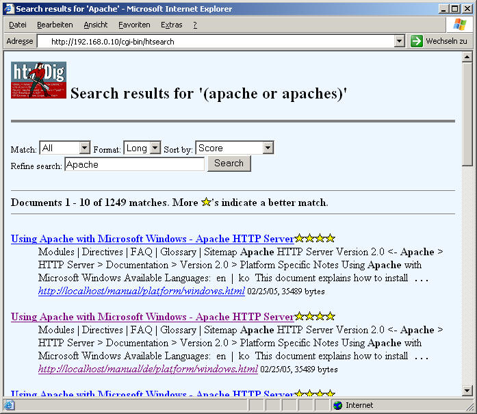 Alle anderen Konfigurationen können erstmal so übernommen werden. Bevor die Suchmaschine genutzt werden kann, ist eine Indizierung notwendig. Hiefür ist das Script: '/usr/bin/rundig' zu starten. Es werden eine Reihe von Datenbanken für die Stichwortsuche im Verzeichnis: '/var/lib/htdig/' erzeugt. Dieser Vorgang kann bei vielen WEB-Seiten und langsamen Rechnern zum Teil mehrere Stunden dauern. Wie schon erwähnt sollte auf der Festpatte ausreichend freier Platz vorhanden sein. Erst wenn das Script: 'rundig' beendet ist, kann mit einen Browser die Suchseite unter der URL: 'http://<localhost>/search.html' aufgerufen werden und eine erste Suche gestartet werden: Die Beispiel-Suchseite: 'search.html' wurde bei der Installation von 'ht//dig' ins Verzeichnis: '/var/www' abgelegt. Die Darstellung der Suchergebnisse erfolgt dann mit einer CGI-Ausgabe. Anmerkungen Damit die deutsche Sprache bei 'ht//dig' besser unterstützt