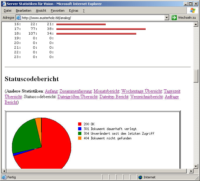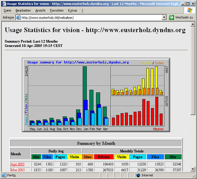 Die weitere oder nachträgliche Konfiguration des Webalizers können per Befehlszeile bzw. Konfigurationsdatei: '/etc/webalizer.conf' erfolgen. Zum Testen sollte nun das Programm auf der Kommandozeilenebene mit: '/usr/bin/webalizer' gestartet werden. Bei jedem Aufruf von 'webalizer' wird immer zuerst die aktuelle Version von 'webalizer.conf' gelesen. Nach Beenden des Programms, liegt die erste Statistik vor und kann mit einem Browser betrachtet werden. Nach Eingabe der URL: 'http://<localhost>/webalizer/' in einem Browser, sollte in etwa folgende Seite erscheinen: Für regelmäßig aktualisierte Daten muss das Programm: 'webalizer' auch entsprechend regelmäßig aufgerufen werde. Je nach Auslastung des Servers und dem eigenen Wunsch nach aktuellen Daten empfiehlt sich eine regelmäßige Aktualisierung alle 24 Stunden bis hin zum Stunden-Takt. Hierzu empfiehlt es sich einen entsprechenden cron-Job zu starten. AnalogAuch ein populärer logfile-Analyseprogramm, ähnlich Webalizer, ist das Programm: Analog. Es ist ebenfalls frei und auch als Debian-Packet erhältlich, so dass die Installation mit: 'apt-get install analog' bequem durchgeführt werden kann. Nach der Installation ist zunächst die Konfigurationsdatei: '/etc/analog.conf' anzupassen, hierzu ein Beispielauszug: