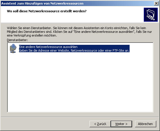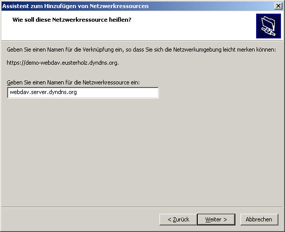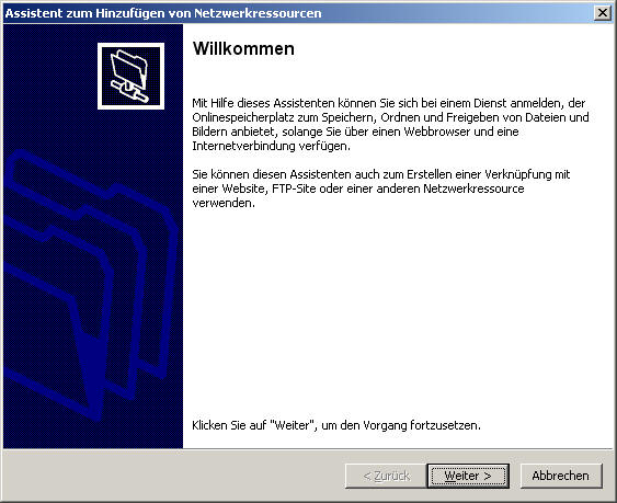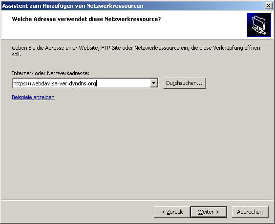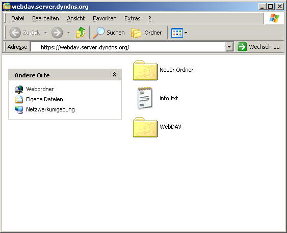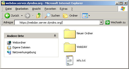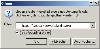 Nach dem Login-Vorgang durch Eingabe von Benutzer und Passwort können diverse Aktionen ausgeführt werden. Eine Übersicht aller Kommandos kann durch Eingabe von 'help' ausgegeben werden. Nautilis / KonquerorVerfügt das Linux-System über eine grafische Oberfläche, so kann direkt mit den jeweiligen Browsern: 'Nautilus' (Gnome) oder 'Konqueror' (KDE) auf ein 'WebDAV'-Verzeichnis zugegriffen werden. Beim 'Nautilus' ist im Hauptmenü: 'Datei / Mit Server verbinden...' zu wählen. Im darauf sich öffnenden Fenster kann in der obersten Zeile: 'Dienste-Typ' zwischen 'WebDAV (HTTP)' oder 'Sicheres WebDAV (HTTPS)' gewählt werden. Alle weiteren einzugebenden Parameter sollten selbsterklärend sein, in einem weiteren Fenster kommt es zur Passwort-Abfrage, danach sollte die Verbindung gegeben sein. Beim 'Konqueror' kann direkt in der Adresszeile z.B.: 'webdav://webdav.server.dyndns.org/' bzw. für eine sichere Verbindung über 'HTTPS': 'webdavs://webdav.server.dyndns.org/' eingegeben werden. Im darauf folgenden Fenster sind wie gehabt die Zugangsdaten einzugeben. Mozilla - FirefoxDer Mozilla-Firefox ist von Haus aus nicht in der Lage auf ein 'WebDAV'-Laufwerk zuzugreifen, damit dieses möglich wird muss ein Add-on: 'Open as Webfolder' im Firefox installiert werden. Nachdem das Add-on installiert ist, kann über rechter Maustaste auf das 'WebDAV' zugegriffen werden. Ein weiterhin interessantes Add-on für den Firefox bezüglich 'WebDAV' ist 'Bookmark Sync and Sort', womit es möglich ist die Bookmarks vom Firefox auf einen 'WebDAV'-Server zu speichern und zu synchronisieren sowie zu sortieren. Die beiden angesprochenen Add-ons können selbstverständlich auch in der Windows-Version von Firefox genauso eingesetzt werden. Zugriff unter Windows auf WebDAVInternet-ExplorerMit dem Internet-Explorer kann am einfachsten auf ein 'WebDAV'-Verzeichnis zugegriffen werden, indem man unter 'Datei / Öffnen...' einfach die Adresse eingibt, z.B.: Wichtig hierbei ist, dass die Check-Box: 'Als Webordner öffnen' aktiviert ist. Nach akzeptieren des 'SSL'-Zertifikates, sollte es zum Login-Dialog kommen, danach sollte die Struktur des 'WebDAV' im Internet-Explorer sichtbar werden. NetzwerkumgebungÄhnlich wie beim Internet-Explorer kann unter Windows auch unter der 'Netzwerkumgebung' ein 'WebDAV'-Server verbunden werden. Dazu ist innerhalb der 'Netzwerkumgebung' auf 'Netzwerkressource hinzufügen' zu klicken, wonach sich ein Assistent öffnen sollte: