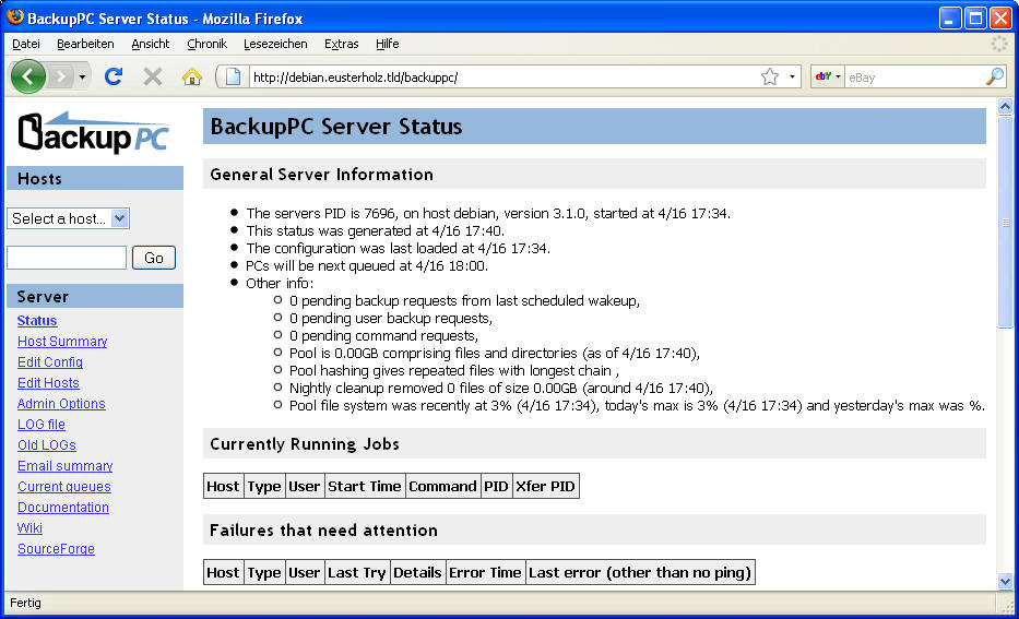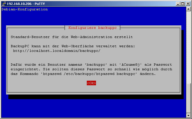 Danach wird ein Standardbenutzer 'backuppc' für die Web-Administration erstellt. Das Passwort des erstellten Benutzers wird bei der Installation angezeigt, es sollte wie vorgeschlagen, mit dem Kommando 'htpasswd' nach Abschluss der Installation geändert werden: Nach Bestätigung mit dem 'Ok'-Buttons sollte die Installation abgeschlossen sein und ein erster Zugang auf die Web-Oberfläche kann versucht werden. Nach Eingabe von Benutzer und Passwort zur Authentifizierung, sollte sich 'BackupPC' im Browser ungefähr wie folgt darstellen: Über den Web-Zugang kann das Sichern/Widerherstellen der einzelnen Clients geschehen, sowie der Status von Server/Clients abgefragt werden. Auch kann hier die Konfiguration des Servers und der Clients zum größten Teil erfolgen, weiterhin steht eine Online-Dokumentation zur Verfügung. Nach der Installation ist als einziger Client der 'BackupPC'-Server selbst, als 'localhost', eingetragen. Mit dem 'localhost' sollte auch schon alles funktionieren, d.h. es kann schon jetzt eine Sicherung bzw. Wiederherstellung durchführen können. Auch sollte man sich jetzt schon mal mit dem Handling des über die Web-Oberfläche vertraut machen. Konfiguration von BackupPCIm weiteren Verlauf wird kurz auf die weitere globale Konfiguration von 'BackupPC' eingegangen. Dabei werden auch schon die ersten Vorbereitungen für zwei zu sichernde Clients berücksichtigt. Wie erwähnt, sollen eine Linux- und ein Windows-Client dem Sicherungs-Server exemplarisch hinzugeführt werden. Die Konfiguration kann über die Web-Oberfläche oder auch in den einzelnen Konfigurationsdateien geschehen. Da die Konfiguration über die Web-Oberfläche zunächst vielleicht etwas verwirrend erscheint und eine gewisse Vertrautheit verlangt, wird die Konfiguration mittels eines normalen Editors direkt in den Konfigurationsdateien erfolgen. Nach der Installation befinden sich die Konfigurationsdateien von 'BackupPC' im Verzeichnis '/etc/backuppc/'. Hier gibt es zwei elementare Konfigurationsdateien, die Datei 'hosts' und 'config.pl'. Die Konfigurationsdatei 'hosts' enthält sozusagen die zu berücksichtigen Clients vom 'BackupPC'-Servers, mit den dazu berechtigten Benutzern. Bezogen auf die Web-Oberfläche sind die Clients in der 'Select-Box' für die einzelnen Clients wiederzufinden. Hier der Aufbau und Inhalt der 'hosts'-Konfigurationsdatei:
