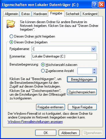 In diesem Beispielen wird der NetBIOS-Name 'notebook' und auch die IP-Adresse '192.168.10.130' korrekt aufgelöst. Als nächstes ist auf dem Windows-Client eine Freigabe für den zu sichernden Bereich zu erstellen. Da in diesem Beispiel der komplette PC gesichert werden soll, ist das Laufwerk , in diesem Fall 'C:' freizugeben: