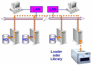 Bei mehreren Rechnern im Netzwerk ist es sinnvoll, Backups zentral auf einem System im Netzwerk abzulegen, so sind die relevanten Daten zentral archiviert und auch eine gewisse räumliche Trennung ist gegeben. Weiterhin wird nur ein Sicherungsmedium benötigt, z.B. ein Bandlaufwerk oder eine zentrale Festplatte, auf der die Datensicherung geschieht. Bei einer Datensicherung im Netzwerk sind zwei Betrachtungspunkte zu berücksichtigen, dabei ist zu unterscheiden welches der Systeme im LAN die Datensicherung inszeniert. In einem Fall sichert ein zu sicherndes System seine Daten auf einen entfernten Server (z.B. Rechner mit Bandlaufwerk), das zu sichernde System inszeniert also selbst die Datensicherung und nutzt nur das andere System nur zum Ablegen seiner Daten. Im anderen Fall inszeniert der Sicherungsrechner selbst das Sichern eines oder auch mehrerer Clients. In diesem Unterkapitel wird auf Verfahren zum Sichern im Netzwerk eingegangen, dabei werden als zu sichernde Systeme Linux- und Windows-Rechner berücksichtigt. Als Sicherungsrechner dient bei den folgenden Beispielen ein Linux-System. Datensicherung Linux-RechnerDatensicherung via NFS-MountSoll ein Linux-Rechner eine Datensicherung eines entfernten Linux-Rechners vornehmen, so sind die zu sichernden Bereiche auf dem Sicherungsrechner zu über das Netzwerk zu verbinden ('mounten'). Zum 'mounten' sind 'NFS'-Kenntnisse notwendig, auf die an dieser Stelle jedoch nicht weiter eingegangen wird (siehe Kapitel: NFS). Nach dem 'mounten' der zu sichernden Bereiche, kann die eigentliche Sicherung so behandelt werden, als wenn es sich um eine lokale Sicherung handelt. Es können nun die zuvor vorgestellten Mechanismen angewandt werden; im einfachsten Fall mit dem Kommando 'cp'. Datensicherung unter Hinzunahme von 'r-Utilities'/'SSH'Soll ein zu sichernder Linux-Rechner seine Daten auf einen anderen Linux-Rechner sichern, so können die Daten via 'rsh' oder noch besser via 'ssh' auf dem entfernten System übertragen werden (siehe Kapitel: 'r-Utilities' und 'SSH'). Zum Schreiben/Lesen der Daten unter Benutzung eines Bandlaufwerks können die schon vorgestellten Programme 'tar' und 'cpio' verwendet werden. Auch sollte gleich eine Pufferung der Daten mit 'buffer' berücksichtigt werden. Hier ein Beispiel für das Sichern auf einen entfernten Rechner: