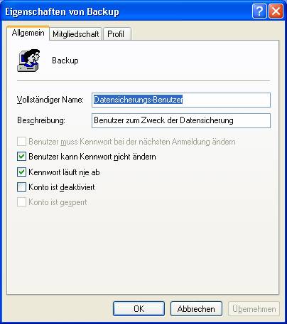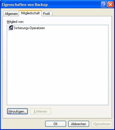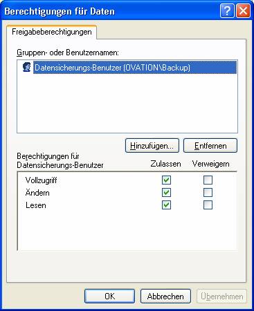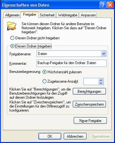 Hier handelt es sich um den Benutzer: 'Backup' und seine Mitgliedschaft ist in einer schon vorgefertigten Gruppe: 'Sicherungs-Operationen'. Die Freigabe eines Ordners zu Datensicherung kann wie folgt aussehen: