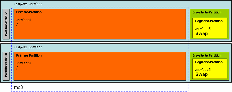 Die folgende Skizze zeigt exemplarisch einen einfachen RAID1-Verbund mit nur zwei Partitionen, wobei die erste Primäre-Partitition als RAID1 betrieben wird (md0).