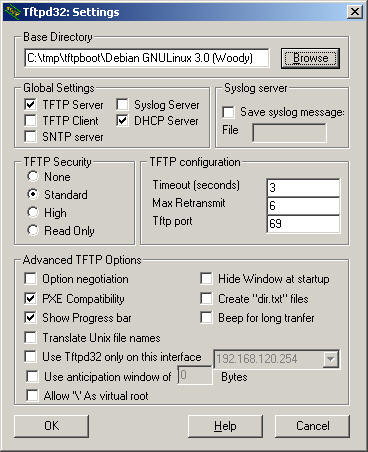 Kernel) eingestellt werden. Ablagestruktur auf dem TFTP: Boot-Loader, Konfiguration, Kernel, InstallerFür den erfolgreichen PXE-Boot ist eine korrekte Bereitstellung der notwendigen Dateien wichtig. Als Basis-Verzeichnis kann z.B. ein Ordner: 'c:\tmp\tftpboot\woody' angelegt werden. In diesem Ordner sind nun alle notwendigen Dateien, wie schon beim Linux Boot-Server beschriebenen, abzulegen. Hier die komplette Ablagestruktur: