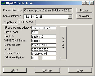 Ein erster Test eines PXE-Boots kann nun stattfinden. Windows PXE-Boot-ServerAuch unter Windows kann ein PXE-Boot-Server relativ einfach aufgesetzt werden. Im Prinzip ist es sogar einfacher, schneller oder praktikabler. Die einzelnen Bestandteile sind wie bei einem Linux-System: DHCP-Server, TFTP-Server und die Bereitstellung der notwendigen Dateien für den Boot. DHCP/TFTP-ServerDas Freeware-Programm: 'Tftpd32' beinhaltet DHCP-, TFTP-, SNTP- und Syslog-Server, sowie einen TFTP-Client. Es eignet sich somit hervorragend für einen PXE-Boot-Server unter Windows. Die Installation besteht eigentlich nur aus dem Entpacken der ZIP-Datei in ein Verzeichnis (z.B.: c:\tmp\tftpd32), danach kann man tftpd32.exe sofort starten.