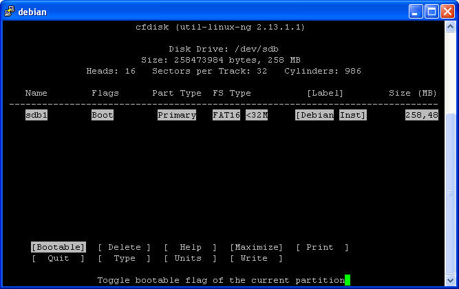 festgestellt werden: 'ls -la /dev/disk/by-id/usb-*'. Nach dem der USB-Stick als Device identifiziert wurde, sollte dieser zunächst mit dem Dateisystem: 'fat16' partitioniert werden. Die Partitionierung ist mittels dem Kommando: 'cfdisk' zu erledigen: