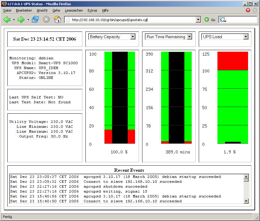 Bei einem abschließenden Test, sollte die UPS so lange ohne Speisung belastet werden, bis die Batterieladung zur Neige geht. Der 'Master' und 'Slave' sollten sich ordnungsgemäß herunterfahren. Haben die Rechner die Tests bestanden, können die Komponenten mit der UPS endgültig gekoppelt werden. Weitere umfangreichere Tests, bezüglich der UPS und 'apcupsd', können mit dem zum 'apcupsd'-Paket gehörenden Programm 'apctest' durchgeführt werden (siehe Anmerkung unten). Online-Status (CGI)Den besten Überblick über den Zustand der UPS, bieten die 'apcupsd Network Monitoring (CGI) Programs'. Dabei handelt es sich um 'CGI'-Programme, die auf einem 'CGI'-fähigen Web-Server ablaufen, mittels Browsers kann der Zustand der UPS dann abgefragt werden. Die 'apcupsd Network Monitoring (CGI) Programs' können mit 'apt-get install apcupsd-cgi' einfach nachinstalliert werden. Durch Aufruf mit einem Browser, z.B.: 'http://<SERVER>/cgi-bin/apcupsd/upsstats.cgi', sollte der Zustand der UPS wiedergegeben werden: Neben 'upsstats.cgi' können weiterhin die 'CGI'-Programme 'multimon.cgi' und 'upsfstats.cgi' aufgerufen werden. Mit 'multimon.cgi' können mehrere UPS auf einem Blick überwacht werden. 'upsfstats.cgi' gibt eine Ausgabe der Status-Variablen von der UPS in Textform aus. Weitere Infos über die 'CGI'-Programme zu 'apcupsd' sind in der Dokumentation zu finden. Sollte kein 'CGI'-fähiger Web-Server vorhanden sein, so kann unter Debian ein Apache-Server leicht mit 'apt-get install apache2' nachinstalliert werden, die 'CGI'-Fähigkeit wird dann durch das Kommando 'a2enmod cgi' erreicht. Anschließend können 'CGI'-Programme einfach in das Verzeichnis '/usr/lib/cgi-bin' abgelegt werden. AnmerkungenSpeziell bei Rechner, die als Server betrieben werden, sollten an eine UPS angeschlossen werden, damit bei einer kurzzeitigen Stromunterbrechung der Betrieb gewährleistet ist und bei einem langfristigen Stromausfall die Server korrekt heruntergefahren werden. Dabei ist darauf zu achten, dass dazwischen liegende Hubs/Switsches ebenfalls mit der UPS verbunden sind, da sonst die Informationen bezüglich 'apcupsd' nicht zum 'Slave' übertragen werden können. Auch sollte der Zeitpunkt zum Herunterfahren für die Rechner so gewählt werden, dass der 'Master' als letzter heruntergefahren wird. Einen erweiterten Test für die UPS kann mit dem Programm 'apctest' erzielt werden. Bevor 'apctest' gestartet wird, sollte jedoch der 'apcups'- Dämon gestoppt werden ('/etc/init.d/apcupsd stop'). Auf der Kommandozeile sollte sich das Programm dann wie folgt melden: