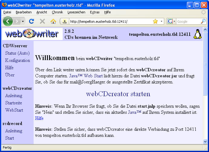 In diesem Beispiel, ausgehend von einer Debian Trivial-Installation, musste für den CD-Brenner '/dev/hdb' die Option 'user' entfernt werden. Nach einem Restart mit '/etc/init.d/CDWserver restart' kann versucht werden auf das Web-Interface zuzugreifen. Der Zugriff geschieht über den als Default vorgegebenen Port '12411'. Auch sollte der FQDN-Name, in diem Fall: 'tempelton.eusterholz.tld' des Systems, für einen Browser-Zugang genutzt werden. Falls alles funktioniert, sollte sich der 'webCDwriter' im Browser ungefähr wie abgebildet darstellen: Bei evtl. noch vorhandene Probleme werden diese auf der Web-Oberfläche (rot markiert) dargestellt, auch werden Lösungsvorschläge gegeben. Auch kann die Konfiguration von der Web-Oberfläche ausgehend, vom Punkt 'Konfiguration'