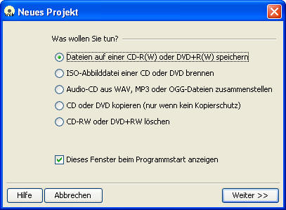 abgeändert werden. Nutzung 'webCDwriter'Wie schon erwähnt ist eigentlich keinerlei Software-Installation auf dem Client (Windows oder Linux) notwendig, d.h. jedoch es muss neben einen Browser zumindest eine 'Java'-Umgebung auf dem Client vorhanden sein. Sollte das nicht der Fall sein so hilft die 'Startseite' mit entsprechenden Links weiter. Um nun den eigentlichen 'webCDwriter' zu starten, brauch nur der Link 'webCDcreater starten' von der Portal-Seite angeklickt werden. Ist dies erfolgreich, so erscheint ein Begrüßungsfenster: Nach der Bestätigung mit 'OK' wird zunächst nachgefragt was gemacht werden soll: Alle nun folgenden Dialoge sollten eigentlich selbsterklärend sein und