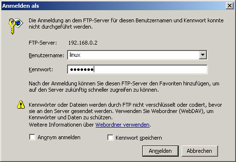 Nach der Kontaktaufnahme mit dem FTP-Server, wird vom Browser nach dem gültigen Kennwort gefragt: Auch kann über das Adress-Feld im Browsers das Kennwort mit übergeben werden. Dazu ist folgende Notation anzuwenden: