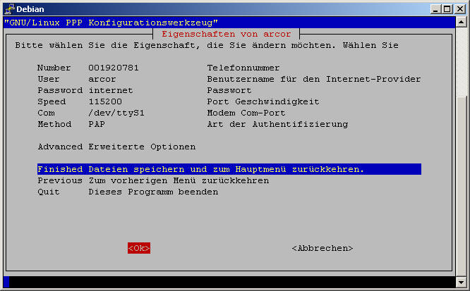 Internet-Zugang mit analogen ModemFür den Verbindungsaufbau ist ein so genannter PPP-Dämon (PPP = Point-to-Point Protocol) zuständig, der sich unter Debian im Paket 'pppd' befindet. Das Programm sollte bereits nach der Basis-Installation von Debian vorhanden sein. Sollte es fehlen, kann es mit 'apt-get install pppd' nachinstalliert werden. Der PPP-Dämon braucht sowohl Informationen über die Hardware des Computers und Modems, als auch über die Zugangsdaten für die Einwahl beim ISP (Login, Passwort). Für die Konfiguration und Verbindungsaufbau des 'pppd' empfiehlt es sich Hilfsprogramme wie 'pppconfig' oder 'wvdial' zu verwenden. Mit diesem Programmen ist es einfach PPP-Verbindungen zu konfigurieren und zu steuern. Dabei ist die Einstellung komplizierter Parameter oder die Erstellung von Skripten/Konfigurationsdateien größtenteils nicht notwendig. Konfiguration mit: 'pppconfig'Mittels des Konfigurationstool 'pppconfig' kann einfach auf der Textkonsole eine Internetverbindung mit einem Modem zum ISP eingerichtet werden. Sollte 'pppconfig' auf dem Debian-System fehlen, kann es mit 'apt-get install pppconfig' nachinstalliert werden. Nach Aufruf des Tools mit 'pppconfig', werden die Parameter für die Verbindung menügeführt abgefragt: Eine Einrichtung z.B. für den Provider 'Arcor' könnte wie folgt aussehen: