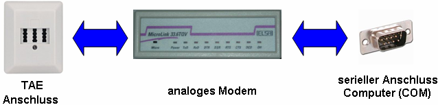 Einer der primitivsten Zugangsmethoden zum Internet hin, stellt heutzutage eine Analog-Modem-Wahlverbindung dar. Der Hauptvorteil dieser Verbindungsart ist die die hohe Verfügbarkeit des analogen Amts-Anschlusses, der immer noch die höchste Verbreitung im Gegensatz zu ISDN oder DSL hat. Nachteile der Modem-Verbindung sind die geringe Übertragungsrate und der lange andauernde Einwahlvorgang. Auf der vorliegenden Seite wird beschrieben, wie ein analoger Zugang mittels eines klassischen Modems zu einem ISP (Internet Service Provider) unter Debian GNU/Linux zu konfigurieren ist. Dabei wird ein Zugang zu einen Provider, der keine Anmeldung verlangt, mit zwei unterschiedlichen Tools beschrieben. Die folgende Abbildung zeigt schematisch die Kette vom Analog-Anschluss (TAE-Dose), über das Modem, bis hin zum seriellen Port des Computers (meist ein D-Sub-Stecker; 9- oder 25-polig):