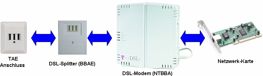 längere Zeit als stabil eingestuft. Hardware-Voraussetzungen für DSLFür den Einsatz zur Nutzung von DSL ist zunächst ein Zugang bei einem entsprechenden Provider zu beantragen. Weiterhin wird ein Splitter, ein DSL-Modem und eine Netzwerkkarte benötigt. Der Splitter oder auch das DSL-Modem wird vielfach vom Provider bereitgestellt. Der Splitter wird in die vorhandene Telefonanschlussdose eingesteckt, dabei ist es egal ob ein analoger- oder ISDN-Anschluss vorliegt. Der Splitter nennt sich in der Telekom-Sprache 'BBAE' (Breitband-Anschlusseinheit) und das ADSL-Modem 'NTBBA' (Netzwerkterminationspunkt Breitbandangebot). Die schematische Kette der Einzelkomponenten ist auf der folgenden Abbildung zu sehen: Auf der Computer-Seite reicht eine handelsüblicher Netzwerkkarte, die mit dem DSL-Modem verbunden wird. Soll der Rechner später als Router fungieren, so ist es ratsam eine zweite Netzwerkkarte einzubauen, da die Konfiguration und das Routing vereinfacht wird. Konfiguration Internet-Zugang mit DSLDebian-Linux (in der Version 3.1 'Sarge') ist für den DSL-Zugang nach der Basis-Installation schon gut vorbereitet. D.h. die Netzwerkkarte ist im allgemeinen schon erkannt und auch ist die notwendige Software zum Einrichten und für den Betrieb von DSL ist vorhanden. Für die DSL-Einrichtung sind folgende Pakete notwendig: 'ppp', 'pppoe' und 'pppoeconf'. Gegebenenfalls können die Pakete mit 'apt-get install ppp pppoe pppoeconf' nachinstalliert werden. Um nun das Debian-System für DSL einzurichten, ist zunächst das Programm 'pppoeconf', als Benutzer 'root', auf der Kommandozeile zu starten. Nach dem Start des Programms sollten folgende Fenster durchlaufen werden:
