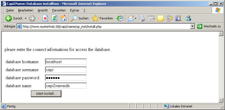 Wichtig ist, dass die Variablen (gelbe Markierung) korrekt für den Datenbankzugriff gesetzt werden. Mittels eines Browsers kann nun die Initialisierung der Datenbank abgeschlossen werden. Dazu ist die Adresse: 'http://<SERVER>/capi2name/up_inst' einzugeben und dem Link: 'install capi2name database' zu folgen: Auch in den Formular sind alle Werte für den Benutzer und der Datenbank anzugeben, mit dem Button 'start install' wird nun die Datenbank initialisiert. Nach Fertigstellung der Initialisierung, sollte dann das komplette Verzeichnis 'up_inst' aus Sicherheitsgründen gelöscht werden:
