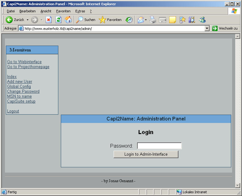 Administration von Capi2NameDamit sollte 'Capi2Name' fertig installiert und konfiguriert sein. Damit nun Benutzer 'Capi2Name' nutzen können muss zunächst administriert werden. Der Aufruf für die Administration kann mittels Browser unter der Adresse 'http://<SERVER>/capi2name/admin' erfolgen. Als Passwort ist ebenfalls 'admin' anzugeben: Nach dem Login-Vorgang sollte zunächst ein neuer Benutzer erstellt werden, der anschließend die Standardoberfläche von 'Capi2Name' nutzen kann. Nach dem ein Benutzer vom Administrator von 'Capi2Name' erstellt wurde, kann dieser sich unter der Adresse: 'http://<SERVER>/capi2name/' einloggen und die Applikation nutzen. Weitere Infos