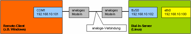 Auch in der Zeit mit schnellen Datenverbindungen, wie z.B. DSL, kann es manchmal sinnvoll sein, am Linux-System, ein analoges Modem als 'Dial-In'-Zugang zu verwenden. Bezogen auf die Microsoft-Welt, kann dieses mit RAS (Remote Access Services) verglichen werden. Gründe, die für einen analogen 'Dial-In'-Server (Einwahl-Server) sprechen sind: