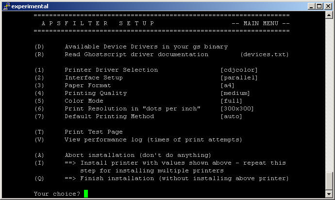 (blaue Markierungen). Prinzipiell ist, sofern ein Postscript-Drucker angeschlossen ist, dass Drucken mit dieser Konfiguration schon möglich. Sollte kein Postscript-Drucker vorhanden sein, kann mittels Filter und einen Postscript-Converter gearbeitet werden. Als Filter kommt 'Apsfilter' in frage. Als Übersetzer nach Postscript kann 'GhostScript' eingesetzt werden. 'Apsfilter' erkennt, wenn das Format eines Dokuments nicht Postscript ist und wandelt das Dokument mit Hilfe von 'Ghostscript' gegebenenfalls um. Mit 'Apsfilter und 'GhostScript ist es so möglich, ein breites Spektrum von handelsüblichen Druckern unter Unix/Linux einzusetzen. Unter Debian kann 'Apsfilter' und 'Ghostscript' wie mittels: 'apt-get install apsfilter gs' installiert werden. Anschließend muss 'Apsfilter' durch Aufruf von: 'apsfilterconfig' auf der Konsole konfiguriert werden. Die Konfiguration von 'Apsfilter' läuft komplett textbasiert ab: Ausgehend vom: 'MAIN MENU', welches nach einigen Fragen/Bestätigungen erscheint, sollten die Punkte: '(1)' bis '(7)' konfiguriert werden. Nachdem die Konfiguration der Filter abgeschlossen ist, sollte zunächst mit: '(T)' ein Testausdruck gestartet werden; gelingt dieser, kann mit: '(I)' die Konfiguration gespeichert werden. Nach dem Speichern, wird die Datei: 'printcap' um die neue Warteschlange (queue) erweitert: