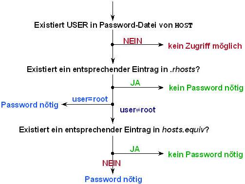 Port: '513' erlaubt ein 'login', Port: '512' und '514' erlaubt das Ausführen fremder Dateien auf einen fremden Rechner. Wurden Änderungen in der Konfigurationsdatei des Super-Dämons: 'inetd.conf' gemacht gemacht, so ist dieser mit: '/etc/init.d/inetd restart' erneut zu starten. KonfigurationBei sämtlichen r-Utilities kann durch entsprechender Konfiguration die Abfrage des Passworts unterdrückt werden, das Passwort wird sozusagen gleichgesetzt. Dabei basieren die Gleichsetzung auf einem Konzept von so genannten 'trusted hosts' und 'trusted users', d. h. es werden nur Befehle ausgeführt bzw. Logins akzeptiert, die von bekannten Logins an bekannten Rechnern abgesetzt wurden. Informationen über solche bekannten Hosts und User werden an in der benutzerdefinierten Dateien: '~/rhosts' und in der globalen Datei: '/etc/hosts.equiv' geführt. Die Datei: '~/rhosts' listet für jeden Account auf, welcher Benutzer sich von welchem Rechner aus einloggen darf. Die Datei liegt im Wurzelverzeichnis des eigenen Heimatverzeichnisses und darf nur für den Besitzer schreib- und lesbar sein.