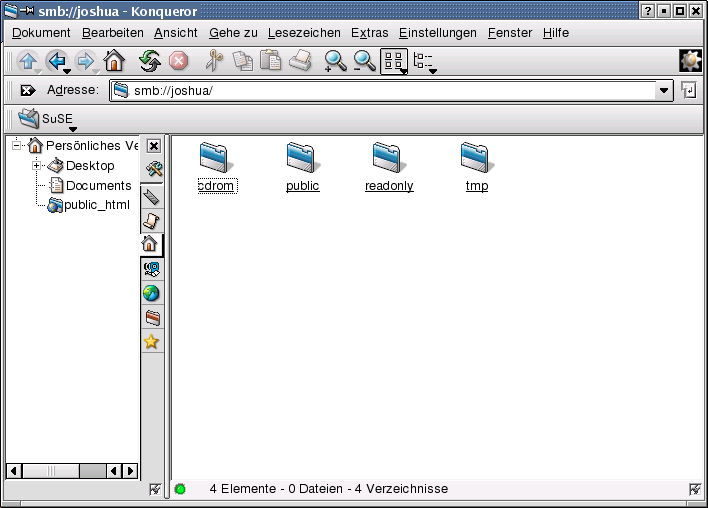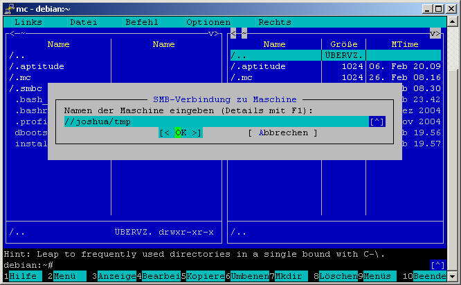 Eine genaue Beschreibung der Optionen kann dem Manualseiten zu 'smbmount', 'smbumount' und 'fstab' entnommen werden. Midnight CommanderAuch der 'Norton-Commander'-ähnliche 'Midnight-Commander' vermag auf SMB-Shares im Netzwerk zuzugreifen. Sollte dieser noch nicht installiert sein, so kann dieses mittels: 'apt-get install mc' nachgeholt werden. Für den Zugriff ist wie gewohnt der Rechner und die Freigabe anzugeben, evtl. ist noch in Benutzer und Passwort anzugeben. Konqueror (KDE)/Nautilus (Gnome)Auch unter den Graphischen Oberflachen wie KDE oder Gnome kann mit den jeweiligen mitgelieferten Dateimanagern auf eine SMB-Freigabe, ähnlich wie unter Windows zugegriffen werden. Unter KDE kommt hierfür der 'Konqueror' und unter Gnome der 'Nautilus' in Frage. Bei beiden Dateimanagern ist dazu in der Adressleiste: 'smb://<SMB-RECHNER>/<FREIGABE>' einzutragen. Hier ein Beispiel mit dem 'Konqueror' unter KDE: