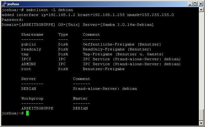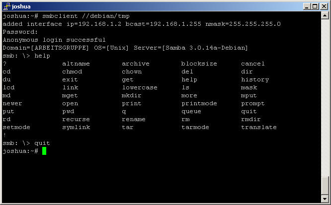Das Passwort kann Optional mit in dem Kommandoaufruf mit angegeben werden. Solle ein Zugriff ohne Passwort-Abfrage stattfinden, so kann anstelle des Passworts '-N' angegeben werden. In diesem Bsp. wird die Freigabe 'tmp' von dem Rechner mit dem Namen 'joshua' zur Verfügung gestellt. Nach dem Aufruf von 'smbclient' findet ein Benutzerdialog (Prompt: 'smb: \>') statt, durch Eingabe von 'help' werden die verfügbaren Befehle angezeigt. smbfs (smbmount/smbumount)Möchte man eine SMB-Freigabe mit ins Linux-Dateisystem einbinden, so empfiehlt es sich hierzu 'smbmount' zu verwenden. Das Tool ist unter Debian erst nach der Installation des Paketes 'smbfs' mittels 'apt-get install smbfs' verfügbar; auch muss der Linux-Kernel das 'smbfs'-Dateisystem unterstützen. Die Vorgehensweise ist ähnlich wie beim Verbinden von zwei Linux Systemen unter NFS mittels 'mount' und 'umount'. Da in diesem Fall ein SMB-File-System verwendet wird, heißen die Befehle 'smbmount' und 'smbumount'. Hier die Übersicht und ein Beispiel: