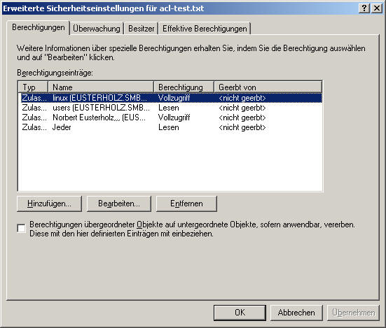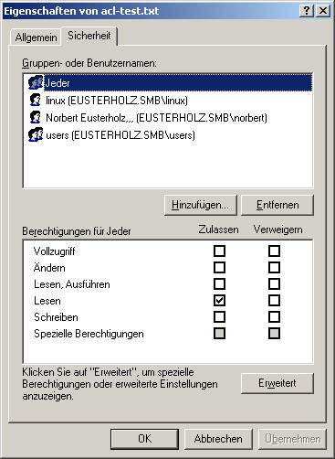 Zu erkennen ist das sich hinter der Spalte Zugriffsrechte ein '+'-Zeichen befindet, welches auf vorhandene ACLs hinweist. Die Rechte für die Gruppe stehen jetzt auf 'rw-'. Sichern/Wiederherstellen von ACLsUm die ACL-Informationen von allen Dateien und Verzeichnissen zu sichern kann ebenfalls Programm 'getfacl' genutzt werden. Hierzu ein Beispiel:Mit der Option '--recrusive' wird alles ausgehend vom Verzeichnis '/home' gesichert, mit der Option '--skip-base' werden alle Dateien ausgelassen die Standard-Unix-Rechte besitzen. Laut Empfehlungen sollte man für jedes Datei-System eine eigene ACL-Sicherung durchführen. Im vorliegenden Beispiel ist das Verzeichnis '/home' auf einem eigenen Datei-System untergebracht.getfacl --recursive --skip-base /home > backup.acl Das Wiederherstellen der ACLs aus der Sicherungsdatei kann mit dem Befehl 'setfacl' erfolgen: setfacl --restore=backup.acl Das Wiederherstellen ist durchzuführen nachdem z.B. eine Datensicherung zurückgespielt wurde. Arbeiten mit ACLs unter WindowsUm unter Windows die ACLs einer Datei zu beeinflussen, sind mit der rechten Maustaste die Eigenschaften der Datei aufzurufen. Unter dem Reiter 'Sicherheit' können die Rechte eingesehen werden. Die erweiterten Zugriffsrechte können durch den Button 'Erweitert' angezeigt und modifiziert werden: