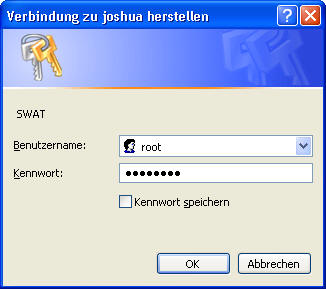 Aufruf von SWATUm nun SWAT nutzen zu können, ist mit einen WEB-Browser die URL: 'http://<SERVER>:901' anzuwählen. Anstatt des Rechnernamens kann auch die IP-Adresse verwandt werden. Die Zahl '901' bezeichnet den Port über den SWAT angesprochen wird. Nach Aufruf der Seite erfolgt zunächst eine Login-Dialog.