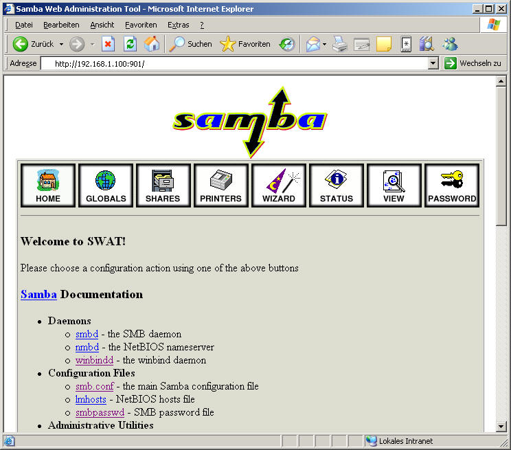 Beim Login dürfen sich alle Benutzer des Samba-Servers einloggen, jedoch hat nur der Admin-Benutzer des Systems ein Schreibrecht und kann somit nur die Konfiguration verändern. Allen anderen Benutzern bleibt die Konfiguration unter SWAT verborgen, sie können nur die Konfiguration anschauen. Als Benutzer mit dem Recht zum Konfigurieren solle nun folgender Oberfläche zu sehen sein: Im Prinzip erklärt sich die Bedienung des Programms von selbst. Es können die globalen Einstellungen 'GLOBALS' geändert werden. Einzelne Freigaben 'SHARES' oder auch der Drucker 'PRINTERS' können editieren, anlegen oder löschen werden. Die getätigten Änderungen werden aktivieren, indem der Samba-Server neu unter dem Punkt 'STATUS' gestartet wird. Die komplette User-Verwaltung kann unter dem Punkt 'PASSWORD' erledigt werden. AnmerkungenBevor die Samba-Konfiguration mit SWAT bearbeitet wird, sollte eine Sicherungskopie der 'smb.conf' angefertigt werden, da SWAT alle Kommentare, include- und copy-Einträge überschreibt. Weitere Infos