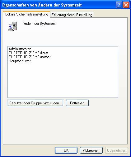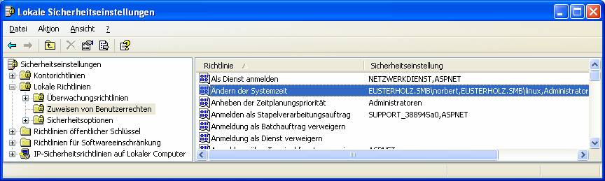 Noch einfacher gestaltet sich das Ändern, durch herunterladen des Registrierungs-Patches 'WinXP_SignOrSeal.reg' (siehe Link unten). Durch einen Doppelklick als lokaler Administrator, auf die Datei werden die Einträge eingefügt. Beim Beitritt zu einer Domain sollte darauf geachtet werden, dass alle Netzlaufwerke getrennt sind. Ansonsten kommt es zu einer Fehlermeldung beim Beitreten zu der Domain. Zeitabgleich am Windows-Clients innerhalb einer DomäneFalls die Systemzeit der Windows-Clients mit dem Samba-Server abgeglichen werden soll, muss in den lokalen Sicherheitsrichtlinie noch eine Änderung gemacht werden. Unter 'Systemsteuerung => Verwaltung => Lokale Sicherheitsrichtlinie => Lokale Richtlinien => Zuweisen von Benutzerrechten => Ändern der Systemzeit' sind die Änderungen als lokaler Administrator auf dem Windows-System durchzuführen.