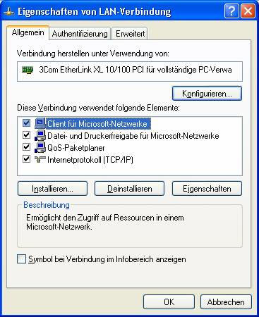 Auf dieser Seite werden die notwendigen Konfigurationen beschrieben, um mit einem Windows-Client auf auf die zuvor vorgestellten Betriebsvarianten des Samba-Servers zugreifen zu können. Dabei wird die Mitgliedschaft zu einer 'Arbeitsgruppe' und zu einer 'Domäne' unterschieden. Die Beschreibungen wird dabei anhand des Betriebssystems 'Windows XP' erläutert, jedoch lassen sich die notwendigen Maßnahmen auf anderen Windows-Varianten leicht ableiten. Am Domänen-Betrieb können jedoch nur auf 'Windows NT' basierende Systeme wie 'Windows NT4', 'Windows 2000' oder 'Windows XP' teilnehmen. Eigenschaften der NetzwerkverbindungDamit der Zugriff auf Ressourcen vom und zum Windows-Client in einem Microsoft-Netzwerk (und Samba) gewährleistet ist, sollte zunächst geprüft werden, ob außer dem Internetprotokoll 'TCP/IP' noch die Typen: 'Client für Microsoft-Netzwerke' und 'Datei- und Druckerfreigabe für Microsoft-Netzwerke' selektiert sind. Bei einer Standardinstallation sind die erwähnten Typen defaultmäßig selektiert. lmhosts-DateiAuch auf dem Windows-System gibt es genau wie beim Samba-Server eine 'lmhosts'-Datei, die der Namensauflösung für Windows-Netzwerke dient. Unter 'Windows XP' ist die 'lmhosts' unter 'C:\WINDOWS\system32\drivers\etc' zu finden oder zu erstellen. Bei der Erstellung der 'lmhosts'-Datei kann die Beispieldatei 'LMHOSTS.SAM' (im gleichen Verzeichnis) als Vorlage genutzt werden. Hier ein Auszug einer 'lmhost'-Datei für Windows: