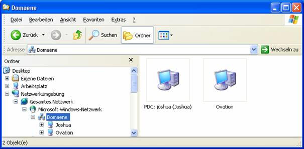 Nach der Meldung: 'Willkommen in der Domäne ...' sollte der Rechner ist nun in der Domäne eingebracht sein, jedoch werden die Änderungen erst wirksam, wenn der Rechner neu gestartet wird. Nach dem Neustart des 'XP'-Systems sollte in der Windows-Anmeldung unter dem Eingabefeld für 'Benutzername:' und 'Kennwort:' eine Listbox 'Anmelden an:' erscheinen, in der die Domäne ausgewählt werden kann. Im Explorer sollte unter 'Netzwerkumgebung => Gesamtes Netzwerk' die 'Domaene' sichtbar sein: In diesem Beispiel befinden sich nur zwei Rechner in der Domäne,