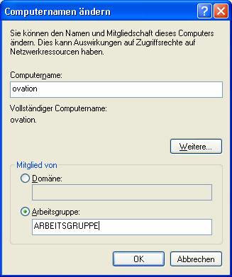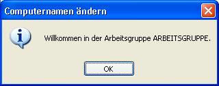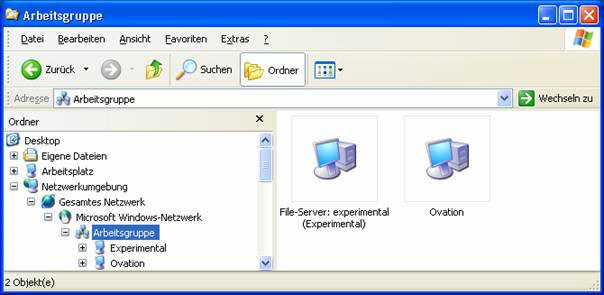 den Windows-Client zu finden. Beitreten zu einer ArbeitsgruppeUm unter 'Windows-XP' einer Arbeitsgruppe beizutreten, ist in der 'Systemsteuerung' das Programm 'System' zu öffnen. Unter der Registerkarte 'Computername' ist 'Ändern' zu betätigen und es erscheint folgendes Fenster: Es ist nun 'Mitglied von Arbeitsgruppe' zu selektieren, weiterhin ist der Name der Arbeitsgruppe anzugeben. In diesem Fall heißt die Arbeitsgruppe ebenfalls 'ARBEITSGRUPPE'. Nach Bestätigung mit 'OK' sollte nun die Mitgliedschaft in der Arbeitsgruppe gegeben sein. Damit die Änderungen wirksam werden, ist ein Neustart des Systems erforderlich. Nach erneuten Anmelden sollte im Explorer unter 'Netzwerkumgebung => Gesamtes Netzwerk' die 'Arbeitsgruppe' erscheinen. In diesem Beispiel befinden sich zwei Rechner in der Arbeitsgruppe, zum einen der Samba 'Stand-alone'-Server 'Experimental' und der gerade zuvor konfigurierte Client: 'Ovation'. Netzlaufwerke verbinden Zum Verbinden eines Netzlaufwerkes kann auf der Kommandoebene, dass schon erwähnte