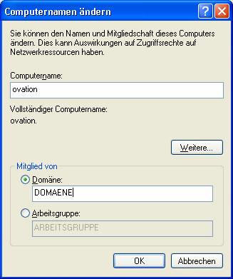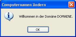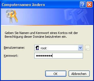 Änderungen bei der 'XP'-Workstation durchzuführen (siehe Anmerkung unten). Es ist nun 'Mitglied von Domäne' zu selektieren und der Name der Domäne einzugeben. In diesem Fall heißt die Domäne 'DOMAENE'. Damit nun der Computer in der Domäne aufgenommen wird, ist nach der Bestätigung mit 'OK', der Benutzernamen und das Kennwort einzugeben: