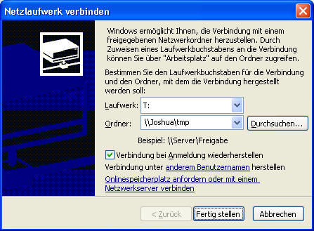 Zunächst ist unter 'Laufwerk:' der Laufwerkbuchstaben, der freigegebenen Ressource zuzuordnen. Unter 'Ordner:' ist der Server und Freigabenamen der Ressource einzugeben. Die Notation dabei ist: '\\<SERVER>\<FREIGABE>'. Möchte man, das die Netzverbindung bei jeder Anmeldung wiederhergestellt wird. so ist die entsprechende Checkbox dafür zu aktivieren. Durch einen Klick auf 'Fertig stellen' wird versucht das Netzlaufwerk zu verbinden. Sofern der Benutzer die entsprechenden Rechte hierfür hat, wird dieses ausgeführt, ansonsten wird ein Dialogfeld geöffnet, wo Benutzername und Kennwort einzugeben sind. Nachdem das Netzlaufwerk verbunden ist, kann es unter dem zuvor gewählten Laufwerkbuchstaben benutzt werden. Beitreten zu einer Domäne Bevor 'Windows XP' auf einen Samba-PDC zugreifen kann, sind einige notwendigen