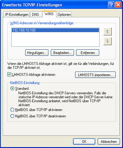In diesem Bsp. ist der 'WINS'-Server unter der IP-Adresse: '192.168.10.100' für