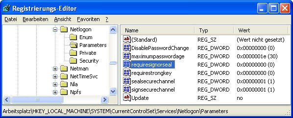 der PDC 'Joshua' und der Client: 'Ovation'. AnmerkungenRegistrierungs-Patch am Windows XP-Client für den Domänen-BetriebDamit die Anmeldung eines 'Windows XP'-Rechners am einen PDC gewährleistet ist, muss die Registrierung von 'Windows XP' geändert werden. Dazu ist der Registrierungs-Editor 'regedt32' ('Start => Ausführen...') zu starten, im Unterverzeichnis der Registrierung ist unter: 'HKEY_LOCAL_MASHINE\SYSTEM\CurrentControlSet\Services\Netlogon\Parameters' der Parameter 'requiresignorseal' von '1' auf '0' zu setzen.